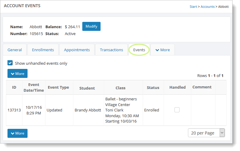 You can view any unhandled events for an account on the Account Events tab. Enrollment events are generated when an enrollment changes. For example, when an enrollment is created or deleted, an event occurs. Another example of an event is when an enrollment has a status change from "enrolled" to "dropped."