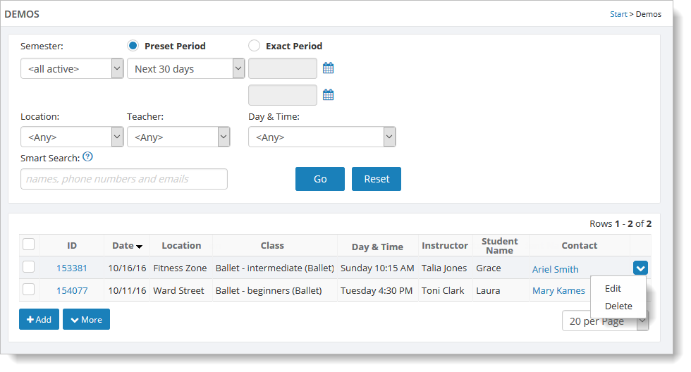 To view your demos, go to Manage > Make-Ups and Demos > Demos. Click on the Go button, and you'll see a full list of your scheduled demos.  You can use the filters to search for any particular scheduled demo.