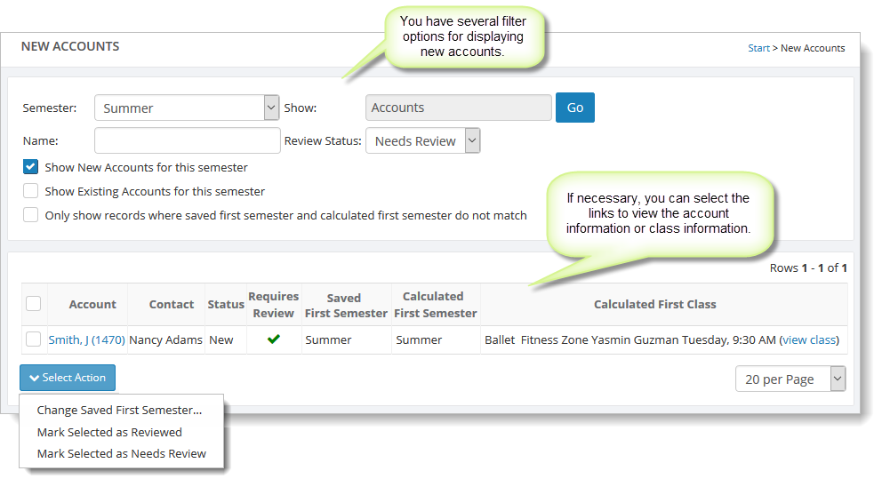 Seeing your new accounts in a list on the New Accounts page is useful for identifying new students on the first day of class (providing a welcome packet, for example).