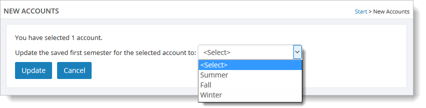 If necessary, you can change the saved first semester for a student (for example, if he or she has decided to delay their start to a later semester). To do this, select a new account (using the checkbox to the left of the account name) and click on "Select Action." Select the "Change Saved First Semester" command.