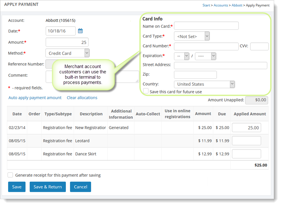 When you enter a payment, it should be applied to outstanding fees in the customer's account. You will need to add the fees first if they don't already exist. See Adding, editing and deleting fees (general) for more information on adding fees. You may also apply fees to credits in the customer's account. Applying a payment to a credit has the effect of reducing the amount needed to pay off any outstanding fees.