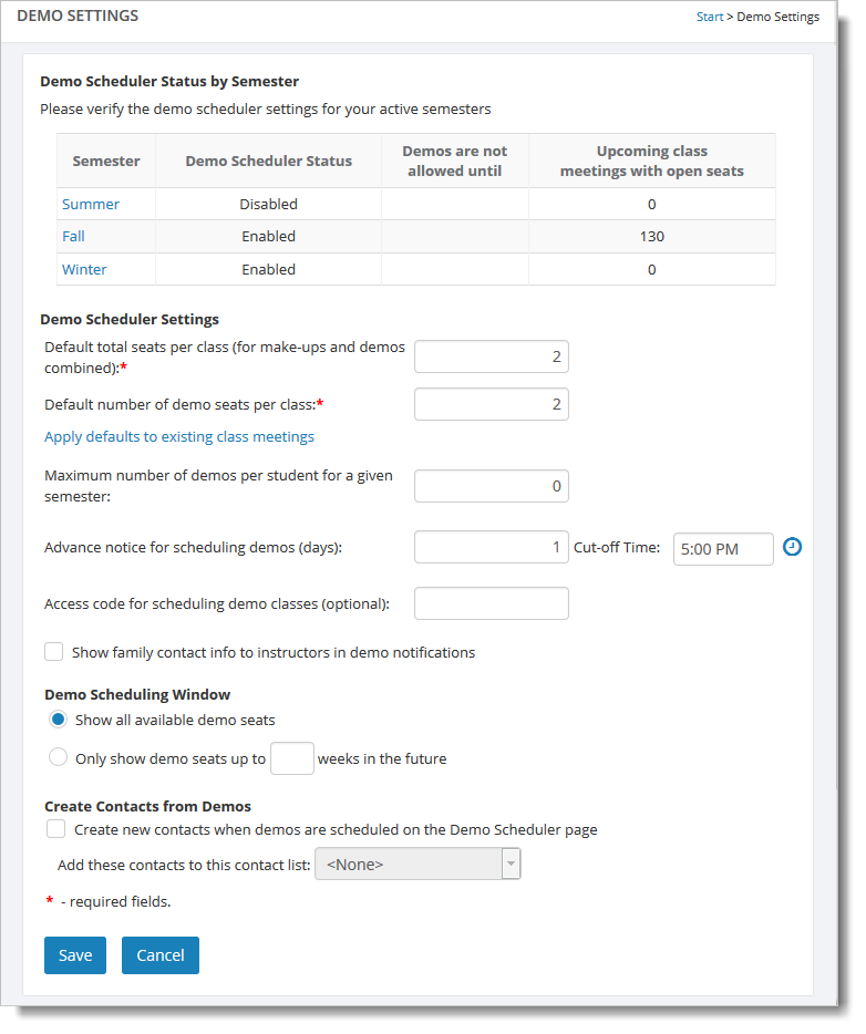 The Demo Scheduler will allow you to turn demos on and off on a semester basis. To do this you must edit the current semester and confirm the values in the "Demo Settings" section, as shown here. Please see How to add and update semesters if you need help editing the current semester.