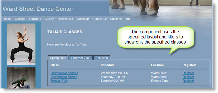 Named Layouts can be used in conjunction with Components to show classes on any page on your website. Components can specify filters like teacher, location, class type or category, so the component will only show a particular set of classes.