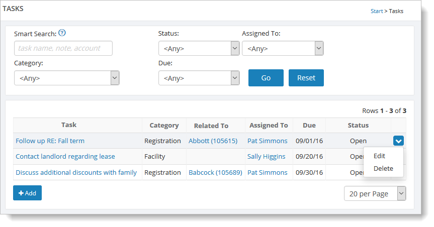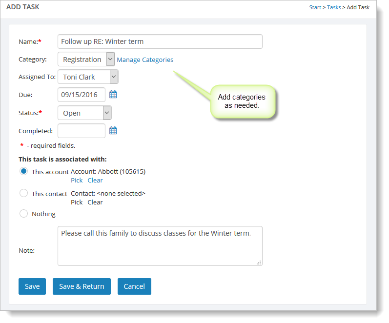 From here, you can click on the "Add" button to add a new task. If you have created any categories, you can assign one to your task. You can also assign the task to anyone you have added at Setup > General > Instructors.