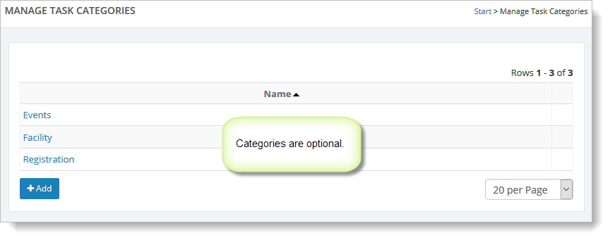 If you'd like to organize your tasks into categories, click on the "Manage Categories" link on the page shown above. From there, you'll see a simple list of task categories.