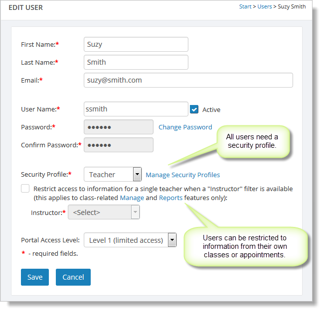 In addition to selecting a security profile for your new user, you can also use the option to restrict data access for this user to a particular teacher from Setup > General > Instructors. When you use this option, the user will only ever be able to select that particular teacher in features like Attendance Sheet report or Manage Classes. Support for this feature does not extend to tools like User Queries.