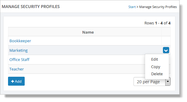 To edit or delete a security profile, hover over it and click the blue down arrow on the far right. This action displays a drop-down list with the "Edit," "Copy" and "Delete" commands. You can also edit a user by clicking the user name. This action takes you to Edit User (shown below).