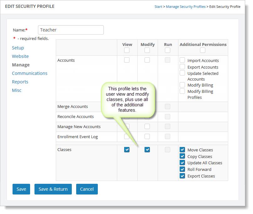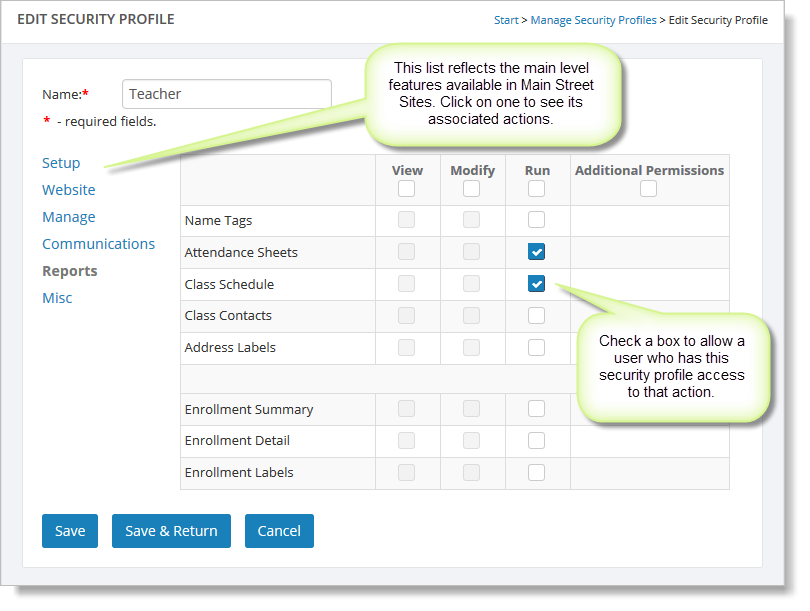 You'll notice at the bottom of the Users grid is a "Manage Security Profiles" link. You'll need to create at least one security profile to grant people access to your Main Street Sites account. The security profile is a list of Main Street Sites features and checkboxes indicating the ability to view, edit or run that feature. For example, to give teachers the ability to update classes, you'd need to give them the "edit" permission for Manage > Classes > Classes feature.